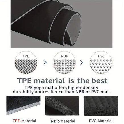 [Upgraded Eco Skin Friendly Material]TPE Is The Latest Technological Improvement To Traditional Yoga Mats. Tested And Certified By SGS, This Mat Doesn't Contain PVC, Latex Or Any Harmful Materials.TPE Material Offers Higher Density, Durability And Resilience Compared To NBR And PVC YOGA MATS. Safe Yoga Mat For Men, Women, Girls, Kids, Etc.