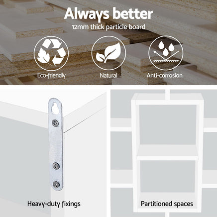 Our Artiss Floating Display Shelf is designed for multiple uses. From a freestanding floor shelf to a wall-mounted floating option, or in horizontal or vertical orientations, the display shelf looks stylish and is practical in every way. The design is simple and timeless and will easily match any decor. Plus, the shelf comes with eight partitioned spaces in varying shapes and sizes to fit an assortment of displays to reflect your lifestyle. Use it as a focus feature or as a complementary piece, the 12mm thick particle board display shelf with smooth melamine finish is sturdy and durable and easy to maintain.