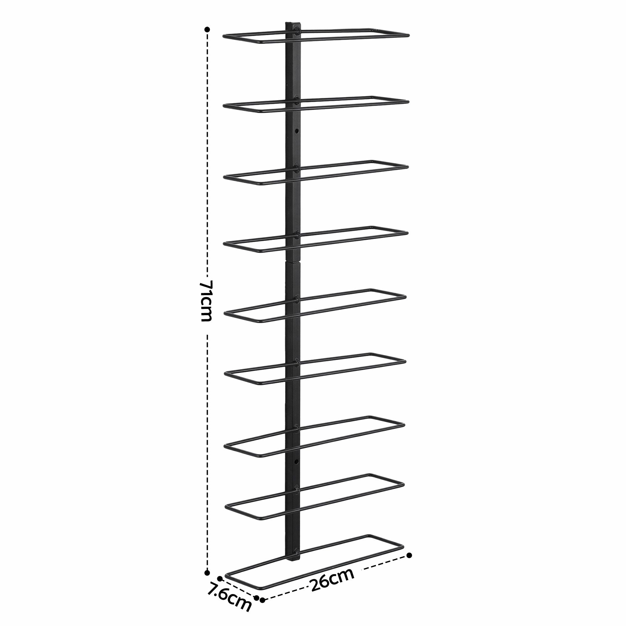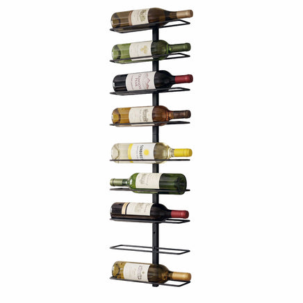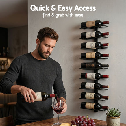 Organize your collection with the Artiss 9-Bottle Wall Mounted Wine Rack. This vertical storage solution is perfect for those looking to save space while adding a modern touch to their decor. Made from robust metal with a black baking finish, it ensures long-lasting use. The minimalist frame allows you to display your bottles horizontally, keeping the cork moist and the wine fresh. It is not just for wine; use it for towels, craft supplies, or water bottles.