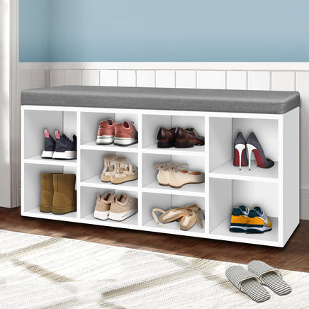 Practical and stylish. Our Shoe Shelf Bench blends two functions into one elegant piece. The shoe shelf features 10 compartments to fit up to 10 pairs of footwear of various shapes and sizes while the fabric bench offers a soft and comfortable rest with its 4cm thick detachable cushioned seat. The entire ensemble is made from particle board for strength and durability. Not least, the two-tone design adds an exquisite touch to this very pragmatic ensemble.