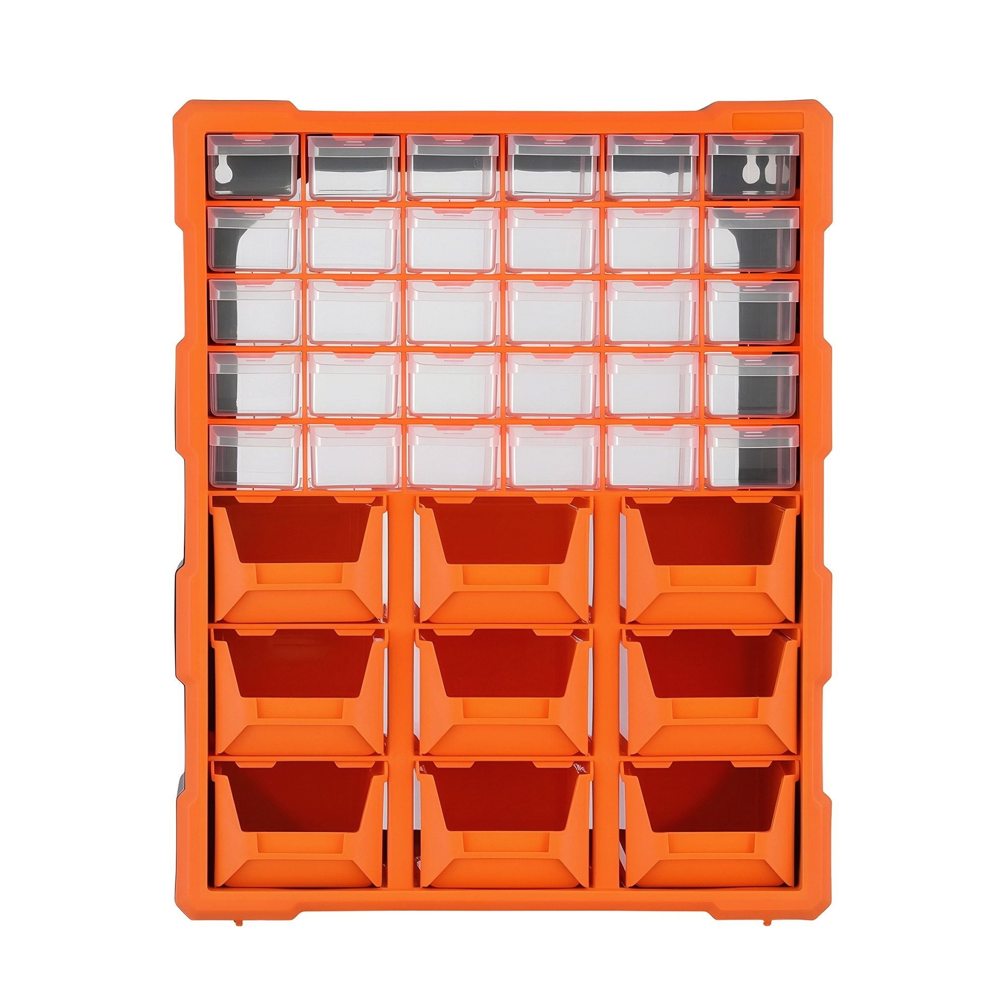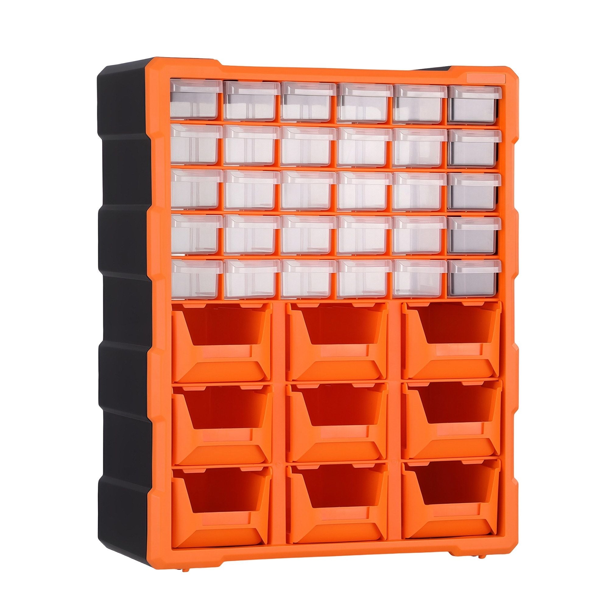 Eliminate the chaos of cluttered workbenches with a storage solution designed for both precision and durability. Our 39-drawer cabinet features a unique hybrid design: 30 small crystal-clear drawers for micro-parts and 9 large high-visibility orange drawers for larger hardware. The sleek black impact-resistant frame ensures long-lasting use in demanding environments like garages and workshops. Compact yet high-capacity, it provides a professional organization system that helps you find exactly what you need in seconds.