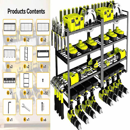 The power tool organizer features a four-tier high-capacity design, dimensions is 80cm x 40cm x 20cm. providing ample space for storage. the First layer features plenty of screwdriver holes for neatly arranging your screwdrivers, The second and third layer can store your charging stations, batteries, toolboxes and various tools, while the bottom layer accommodates 8 cordless drills.Additionally, side holders for hammers and pliers enhance organization.