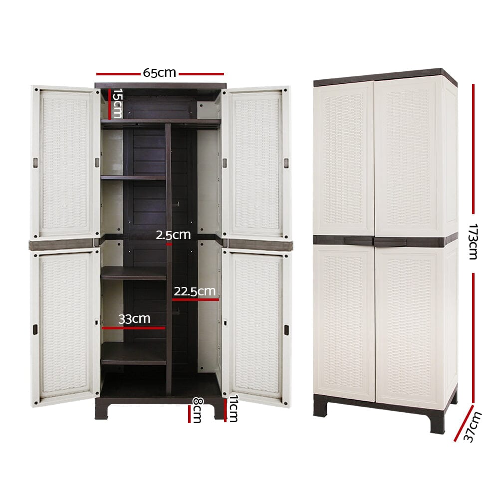 Outside, the weather-resistant Storage Cabinet features premium plastic construction with corrugated panels for both reinforced support and stylish looks. Security and safety is also enhanced with lockable doors that can be secured with a range of locks. Not least, the entire unit stands on large stilted feet to keep it away from floods, spills or wet floors.