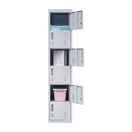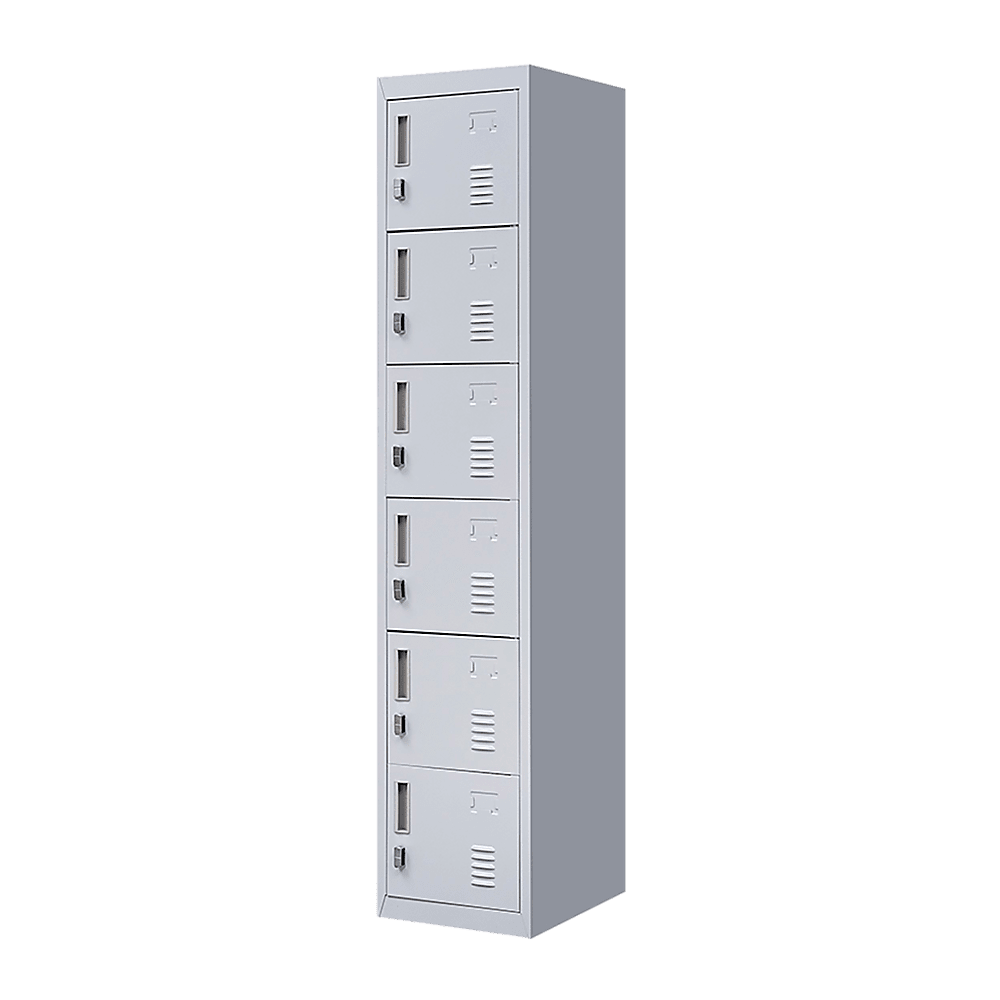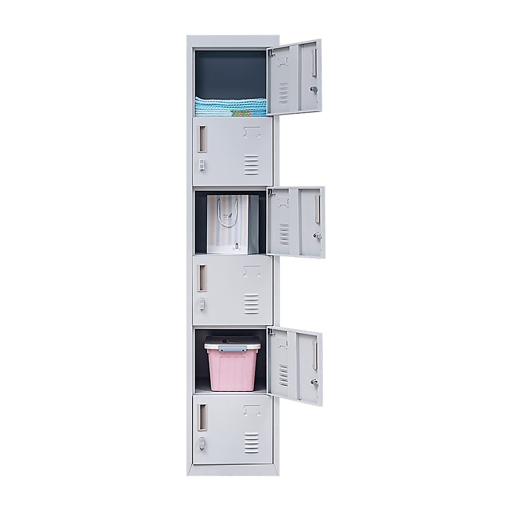 The unit measures 1800 x 380 x 450mm, and several units can be seamlessly placed side-by-side. Made with durable steel, the unit features six stacked square lockers with vents for air circulation and spaces for name tags or plates. The unit can hold up to a maximum weight capacity of 80kgs in total.