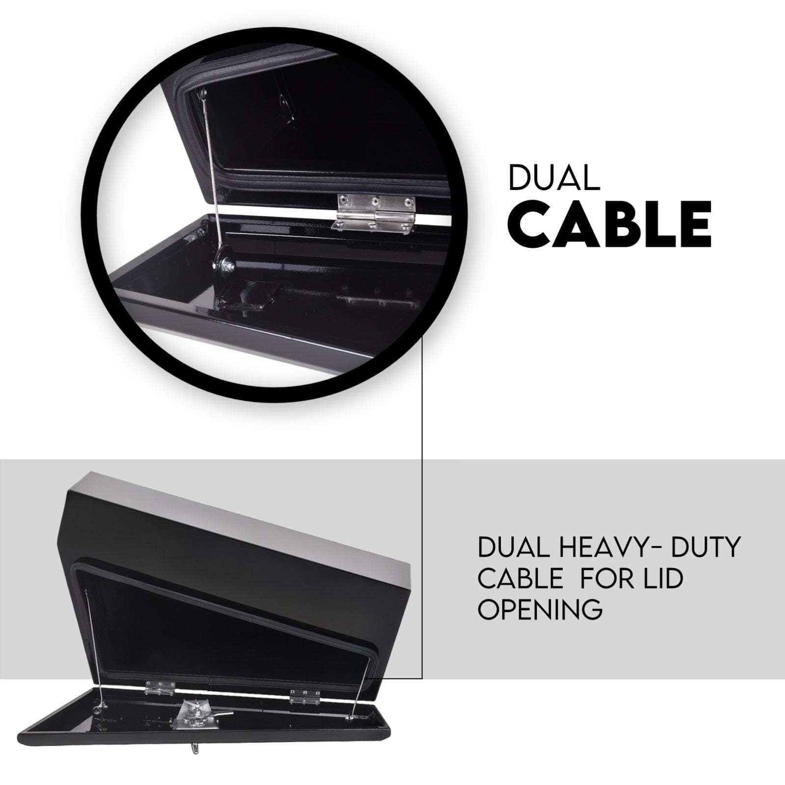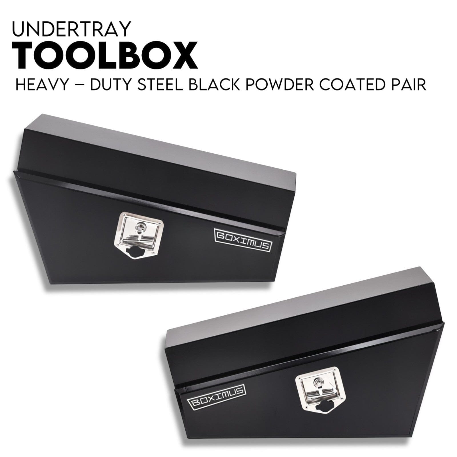 Keep your tools safe and your ute tidy with the Boximus 750mm Black Steel Under Tray Tool Box Pair. Built from heavy-duty powder-coated steel, these boxes are made to handle the roughest worksites and toughest Aussie weather. Each box features a weatherproof rubber seal, stainless T-handle lock, and dual support cables for smooth lid operation. Fully welded seams keep dust and water out, while the sleek black finish adds a clean, professional look under your tray. Whether you’re a tradie, farmer, or weekend adventurer, Boximus tool boxes give you reliable, space-saving storage that’s built to last.