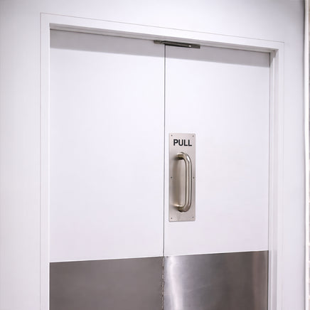 The PULL handle plate features an integrated tubular handle for a firm, comfortable grip, while the PUSH plate provides a clean, flat surface for easy operation. Both plates are made with a 1.3mm thick stainless steel sheet for enhanced strength and rigidity.