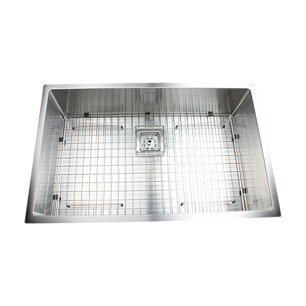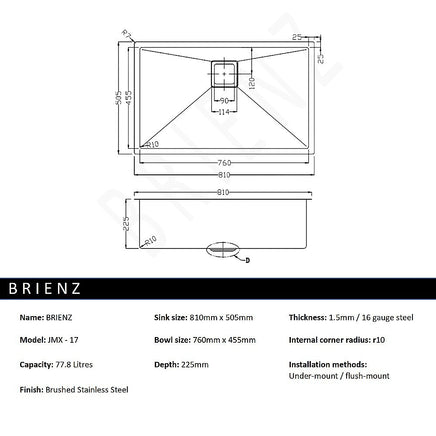 This single sink is made from 1.5mm-thick Type 304 stainless steel with a satin finish for a brilliant look that will last and last. It measures 810 x 505 x 225mm (L x W x D) with a 90mm drain opening. A Square Strainer waste is included. Installation is Undermount / Topmount-style.