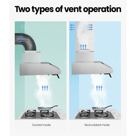 Do you suffer from stifling odours and stubborn smoke or steam from your cooking? Say goodbye to smells and stains with the Devanti 60cm Range Hood. Made from stainless steel with a sleek glass visor, the range hood looks and functions perfectly for a busy kitchen. Featuring a powerful extraction rate of 180m/hr from a high-performance motor, our stainless-steel range hood will clear the air of smoke, steam, odours and vapours in no time. The non-stick and removable 5-layer aluminium grease filter ensures all grease is efficiently captured. Clear and bright LED lights and a stylish glass visor also provide vivid illumination for your cooking area, so you can see everything you're cooking. Completing the job is a 3-speed fan that can be easily selected with the push button controls. The range hood is easy to install and suitable for 12cm diameter exhaust tubes, standard Australian plugs, and ducted or recirculated exhaust modes. For clean and clear air in your home, you can't cook without a Devanti Range Hood.
