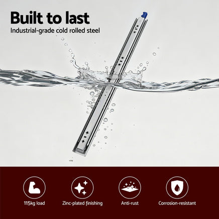 Enhance your storage setup with the Giantz Heavy-Duty Drawer Slides, engineered for superior performance and durability. Available in a range of lengths from 500mm to 1000mm, these slides can handle a substantial load of up to 115kg, making them perfect for your toughest projects. Whether it's a UTE toolbox, a camper trailer's storage, or a 4WD cargo system, or household cabinets, these slides provide reliable support. Experience effortless operation with the precision ball bearings, ensuring a smooth and silent glide every time. The integrated nylon buffer design offers a soft and quiet close, while the optimized PP triggers make locking and unlocking simple and safe. Built from thickened zinc-coated cold-rolled steel, these slides are designed for a long lifespan, capable of withstanding over 50,000 opening and closing cycles. The lock-in/lock-out design ensures your drawers stay securely in place on uneven ground. With full extension, you can easily access items at the very back of your drawer, maximising your storage and convenience. Upgrade your drawers with Giantz and enjoy a combination of strength, safety, and smooth functionality.