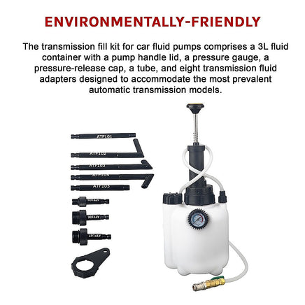 Take the hassle out of automatic transmission fluid changes with this 3L Manual Transmission Oil Filling System. Built for durability and efficiency, this high-quality hand pump kit is ideal for workshops, garages, and at-home mechanics. It features a robust 3-litre container, precision pressure gauge, and 8 automatic transmission fluid (ATF) adaptors compatible with a wide range of vehicle models.