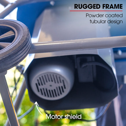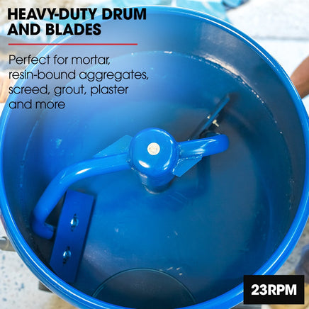 With a robust 100L heavy-gauge steel pan and a powder-coated frame and solid rubber wheels, this workhorse is built to endure tough job site conditions. At its core, a high-torque 1100W motor quietly powers the dual mixing arm at 23 RPM, ensuring a thorough and even blend of materials such as mortar, resin-bound aggregates, screed, grout, plaster, cement and more. Plus, the protective motor cover shields it from spills, keeping your mixer in top condition for the long haul.