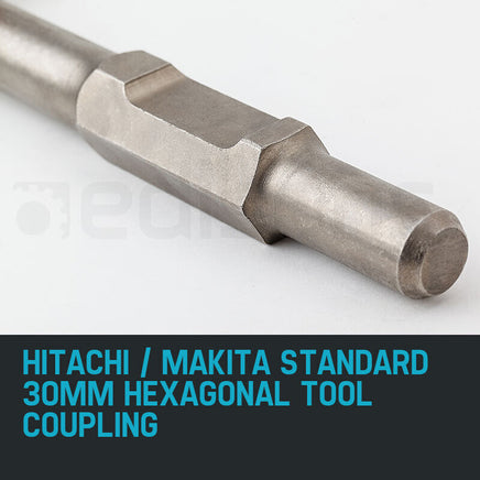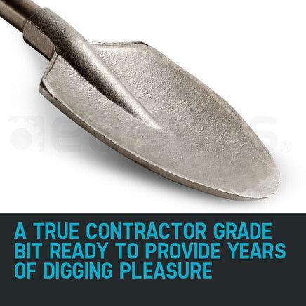 This extra-wide 130mm pointed-tip clay jack hammer bit turns your jackhammer into a powered mega spade! This type of gouge is best suited for hard soil that bends ordinary shovels - time to get your own ultimate jack hammer chisel bit! The full 130mm width and super thick spade base means you only ever need to buy one of these. Resharpen time after time with plenty of meat. A true contractor grade bit ready to provide years of digging pleasure!
