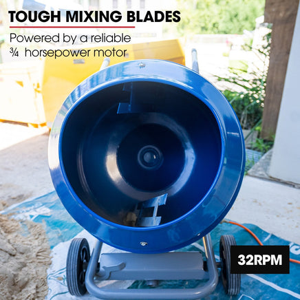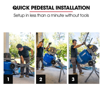 The durable steel drum handles heavy use, while the included pedestal stand allows for easy pouring into raised forms and wheelbarrows. Built for real job sites, the 10 rubber wheels glide smoothly over rough terrain, and the sturdy steel frame withstands tough conditions.