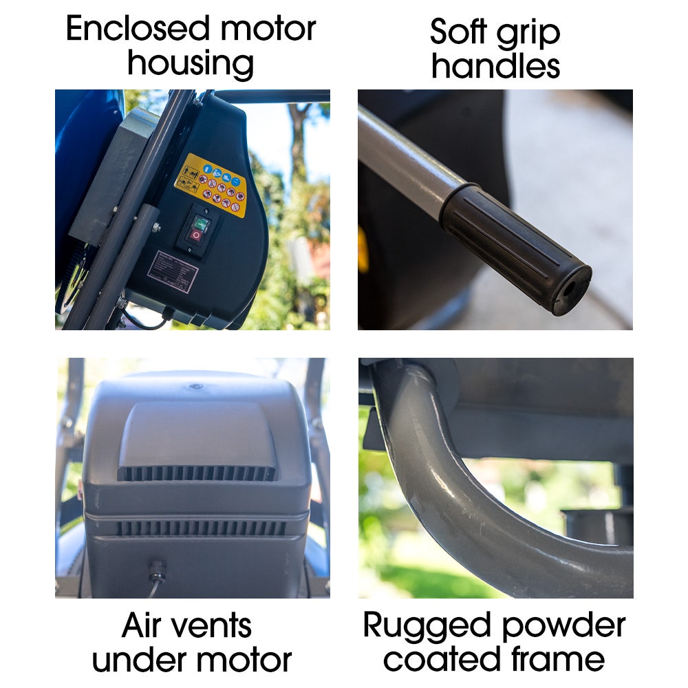 At its core, a high-torque 550W motor quietly powers through demanding mixing tasks, handling regular starting under load with ease. With two steel mixing blades spinning at 32 RPM, it ensures a thorough, even mix of concrete, mortar, and other materials.