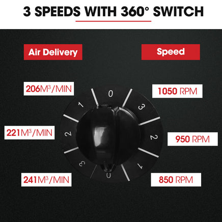 - Speed: 850 RPM, 950 RPM, 1050 RPM