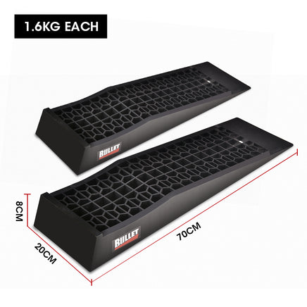 This pair of Bullet Low Profile Car Ramps have been tested to be compatible with tyres as wide as 295 series, making them suitable for most high performance vehicles. The acute 9° approach angle and 6.5cm lift height enable sufficient clearance to get a trolley jack under lowered vehicles for maintenance and DIY. Having exceeded strict TUV German certification standards, you can be assured that they offer the highest quality and safety credentials.