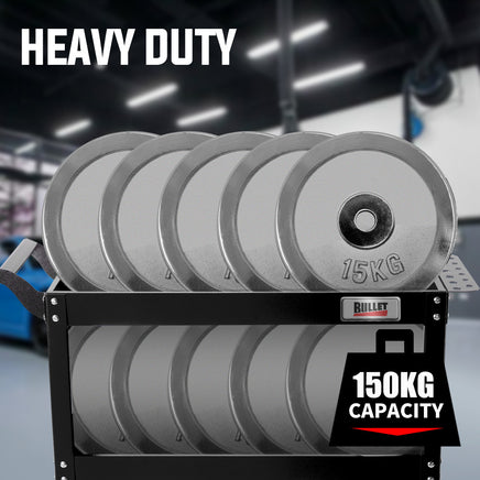 The Bullet 3-Tier Steel Tool Cart is a must-have for tackling jobs anywhere around your garage, warehouse or workshop. This heavy-duty manoeuvrable storage solution has a load capacity of 150kg---plenty for all your tool and accessory transport needs!