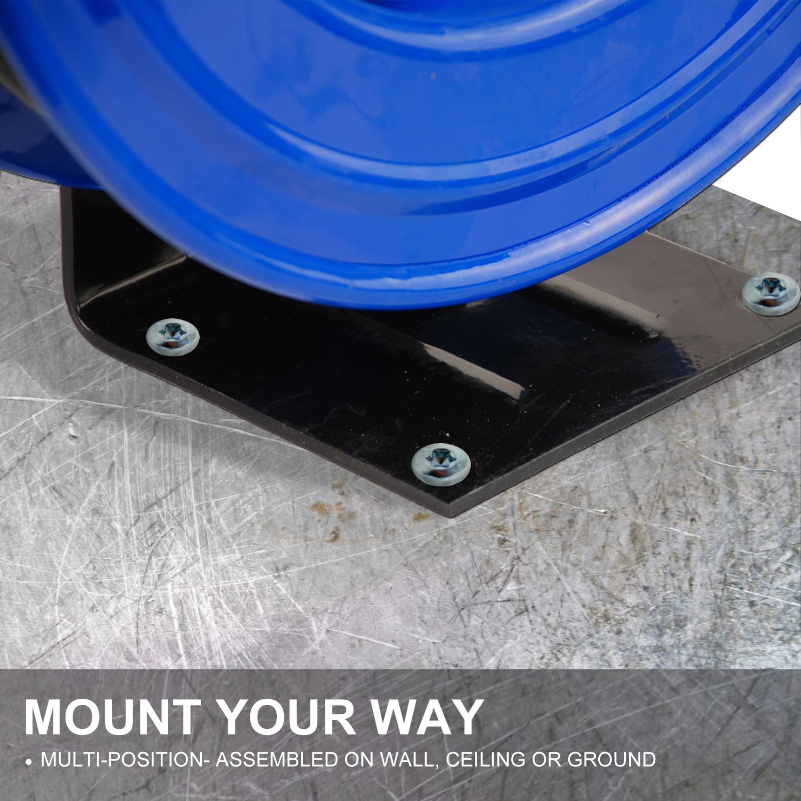 This Dynamic Power Rewind Hose Reel is a new Concept in Hose Care. It's Neat and Tidy and can be Mounted on the Ground, Wall, Overhead or on your Vehicle. This Air Hose Features Heavy-Duty Steel Case, Positive Rewind Action, Auto-Lock and Full Flow Swivel. It also features as 300PSI Air Hose which can be used for most of the Air Tools. This is the Perfect Addition to any Garage or Workshop that needs to keep their Air Hose Clean and Tidy.