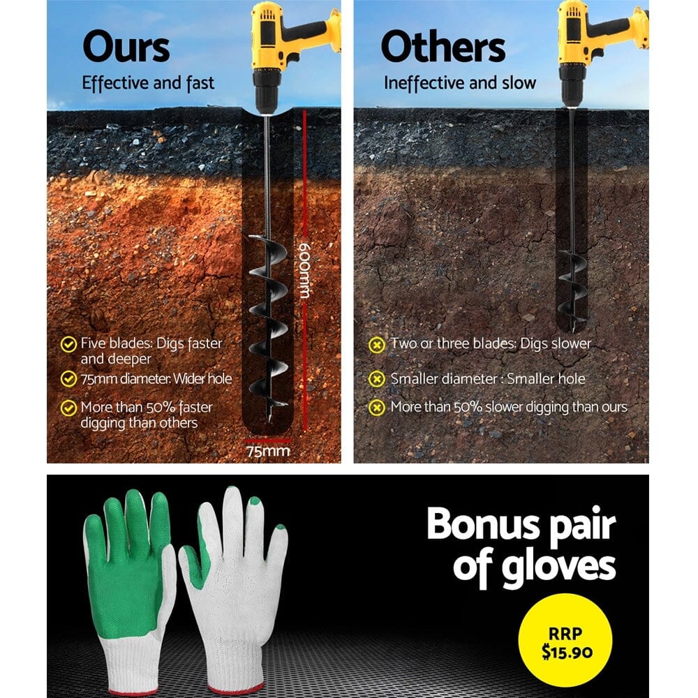 For past preparation of planting groundwork, nothing beats the Giantz Power Auger to complement your power digging. The augur is made of heavy-duty steel for durability and strength and will not easily succumb to tough handling and drilling. It can dig up to 60cm deep depending on the model with a 7.5cm diameter hole and is compatible for use with most power drills. It will fit into a 13mm chuck perfectly. It can used in most ground surfaces including solid clay, gravel soil, sand and shale soil.