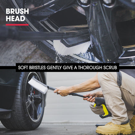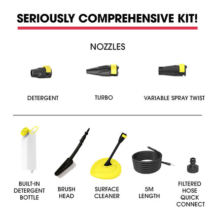 Attaching the detergent bottle allows you to easily apply suds when cleaning cars while the brush head attachment provides extra scrubbing power. The surface cleaner head is ideal for decks, paths and driveways. With a Vari-Nozzle, a Detergent Nozzle and a Turbo head, this High Pressure Washer offers versatile cleaning options to suit any task!