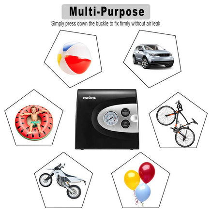 【WIDE RANGE OF USES】:The wide range of uses this pump offers provides even better value. The air pump includes 2 high air-flow nozzles and adapters allowing it to be easily used on many kinds of tires without worrying about finding an external power supply. It can be used to inflate car, bike, motorcycle, RV, SUV and ATV tires, as well as sports equipment and inflatables.