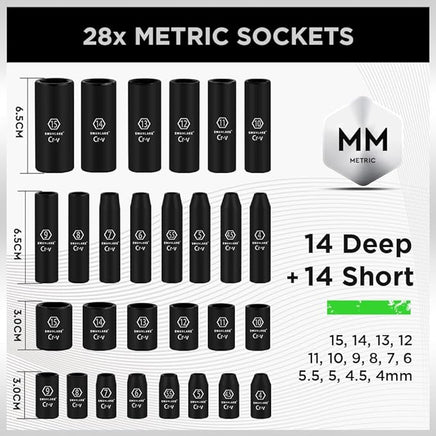 • Product specification includes 1/4-Inch Drive Ratchet Handle, 3" and 8" drive impact extension bar, 1/4" universal joint, 3/8" to 1/4" reducer and the following socket sizes: SAE, Deep: 5/32, 3/16, 7/32, 1/4, 9/16, 9/32, 5/16, 11/32, 3/8, 7/16, 1/2, 9/16 (inches), Shallow: 5/32, 3/16, 7/32, 1/4, 9/16, 9/32, 5/16, 11/32, 3/8, 7/16, 1/2, 9/16 (inches) ,Metric Sizes: Deep: 4, 4.5, 5, 5.5, 6, 7, 8, 9, 10, 11, 12, 13,14,15mm, Shallow: 4, 4.5, 5, 5.5, 6, 7, 8, 9, 10, 11, 12, 13,14,15mm