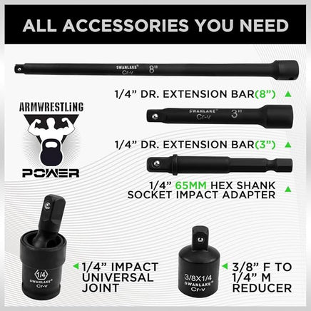 SWANLAKE 1/4" Drive Impact Socket Set, 56-Piece Standard SAE (5/32 to 9/16 inch) and Metric (4-15mm) Size, 6 Point, Cr-V, 1/4-Inch Drive Ratchet Handle, Drive Extension Bar, Impact Universal Joint