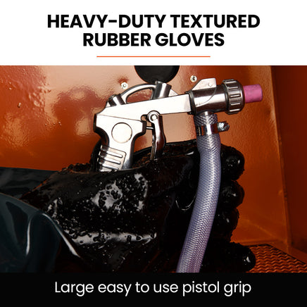 Introducing the Unimac 110L Sandblasting Cabinet. Upgrade your sandblasting experience. Operating this sandblaster is a breeze, simply connect your air compressor to the 12mm threaded air fitting, fill the cabinet with your preferred blasting medium, and place your item inside.