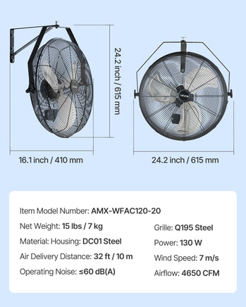 This industrial wall mount fan delivers high airflow to quickly lower temperatures, blowing up to 26.3 ft (8 m) Ideal for workshops, warehouses, hot kitchens, and other demanding conditions