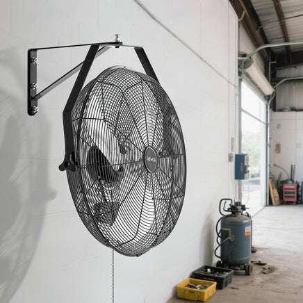 The wall-mounted fan features a space-saving hanging design that installs securely on patios, garages, sheds, factories, and more for versatile cooling in various conditions