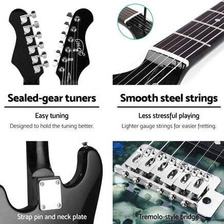 And to make things even easier for you to get started on your music escapades, our combo set also includes a 20W guitar amplifier with controls for bass, middlle, treble, gain. There is also a headphone input to stop the neighbours from complaining night and day. So rock on with the Alpha Electric Guitar Combo Set for heaps of awesome coolness. Get yours today.