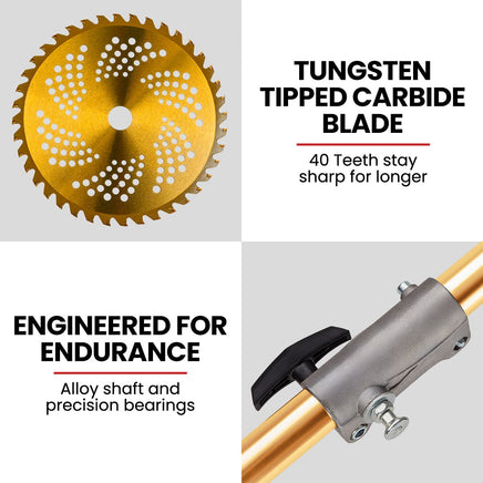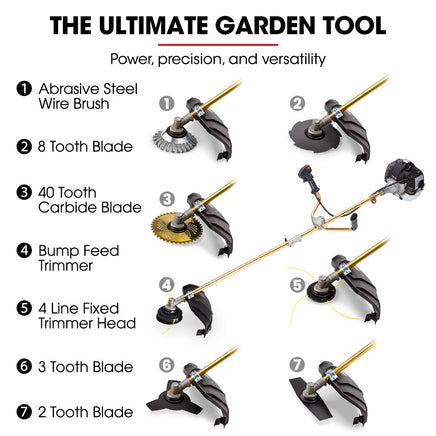 - Blades: 40T Gold Series Saw, 8T Saw, 3T Slasher, 2T Lawn Edger, Weed Brush Steel Wire Trimmer