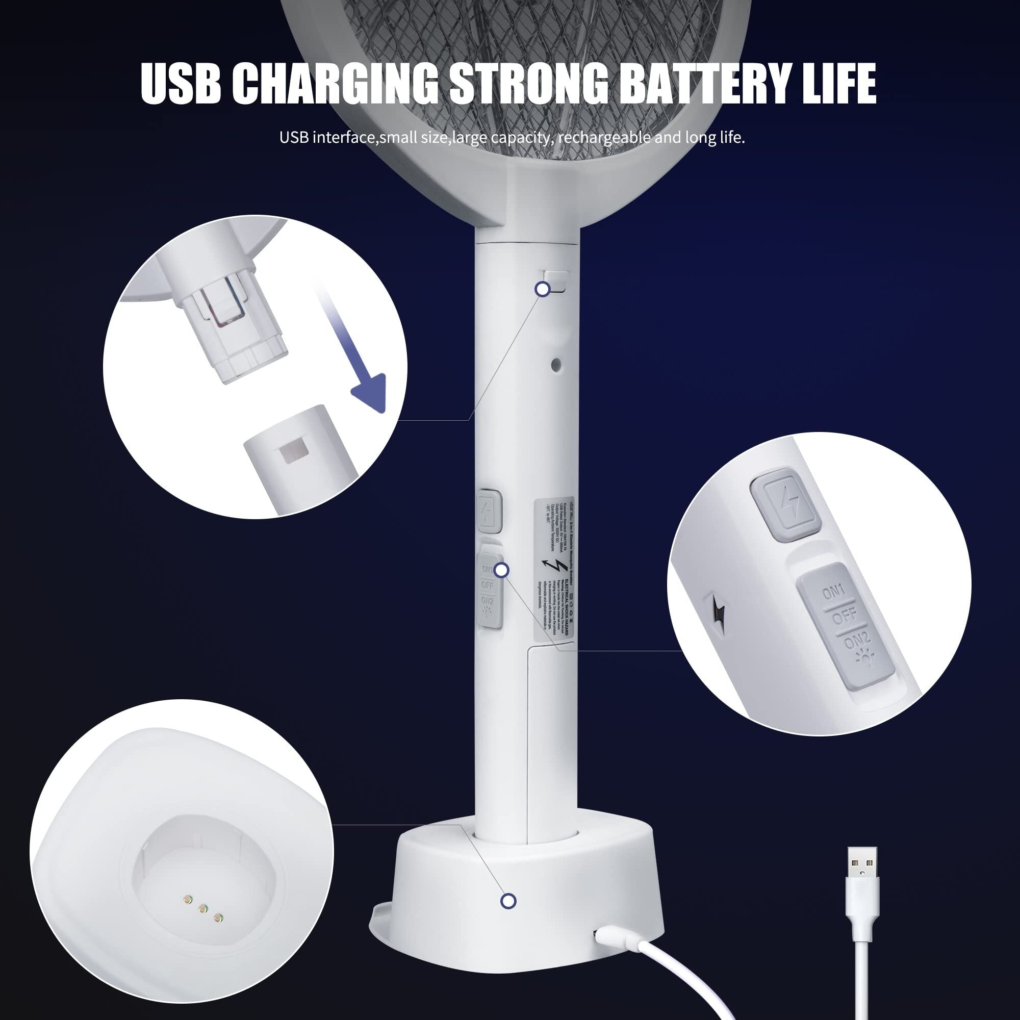 Dual-Mode UV Electric Mosquito Swatter with LED Attraction 3000V Zapper Rechargeable Bug Killer for Indoor and Outdoor Use (White)