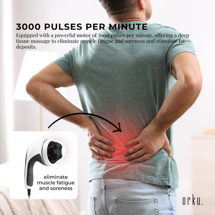 A professional handheld body massager with stylish ergonomic light weight design. Equipped with a powerful motor of 3000 pulses per minute, offering a deep tissue massage to eliminate muscle fatigue and soreness and stimulate fat deposits.