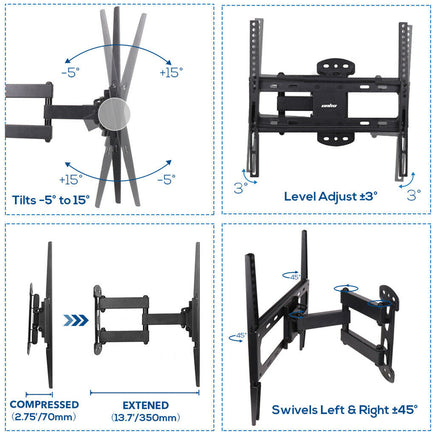 - Enhanced Viewing Experience: Enjoy the freedom to tilt, swivel, and extend your TV. Tilt up and down to reduce glare, swivel left and right for the perfect view from any angle, and extend up to 16 inches to bring your favorite shows and movies to life.