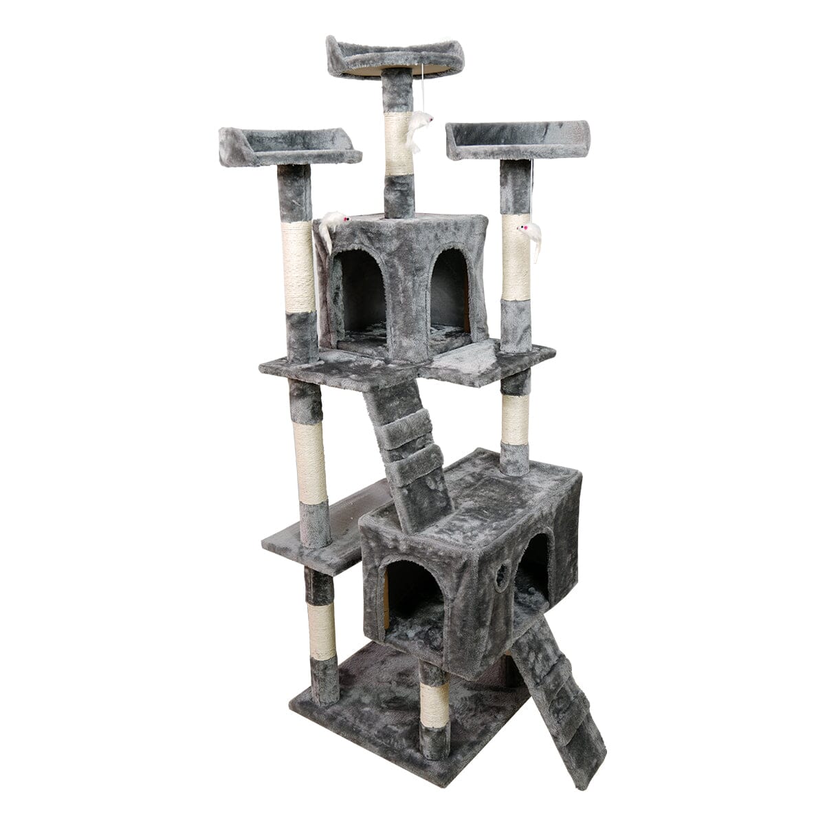 At 170cm tall, it features two cubby houses, two ramps and multiple shelves to perch, climb and nap on. The dangling toys right at the top provide a healthy outlet for your cats hunting instincts. And the built-in scratching posts will let your cats sharpen their claws without damaging your rugs or furniture.