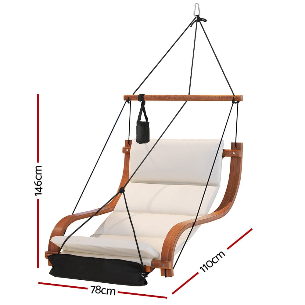 Indulge in the ultimate lounging experience with the Gardeon hanging hammock chair. Whether you want to curl up with a book indoors or enjoy a peaceful moment outdoors, this hammock chair makes a perfect companion. Its designed for both indoor and outdoor use. You can style it anywhere. The hammock chair features a soft cushioned seat, providing a comfortable seating experience. Let the worries of the day fade away as you unwind in this hammock chair. For durability and long-lasting use, this hammock chair is crafted from sturdy pine wood. Additionally, the natural beauty of the wood adds a touch of elegance. The hanging hammock chair also features a metal fastening system that ensures safe and secure seating and quick and hassle-free installation, allowing you to effortlessly hand the chair in your desired location. Furthermore, enjoy the convenience of the attached cup holder, where you can keep your favourite beverage within arms reach. And the attached footrest allows you to elevate your legs and experience complete comfort and relaxation. Shop this Gardeon hanging hammock chair today to relax your way.