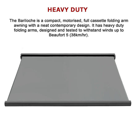 The Bariloche is a compact, motorised, full cassette folding arm awning with a neat contemporary design. It has heavy duty folding arms, designed and tested to withstand winds up to Beaufort 5 (38km/hr).