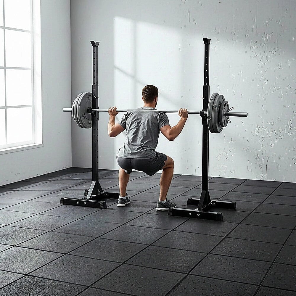 Strength training not only increases your muscle power, lessening the load on your joints, but it also helps boost cardiovascular health. With this pair of heavy-duty barbell stands from Randy Travis Machinery, you and your whole household can enjoy a rigorous workout tailored to your individual needs.