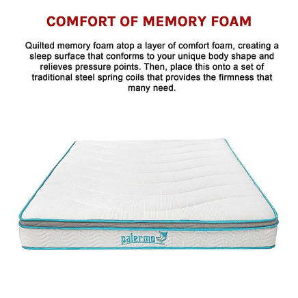 Welcome to the revolutionary comfort of the Palermo hybrid mattress. We quilted memory foam atop a layer of comfort foam, creating a sleep surface that conforms to your unique body shape and relieves pressure points. Then, we place this onto a set of traditional steel spring coils that provides the firmness that many need.