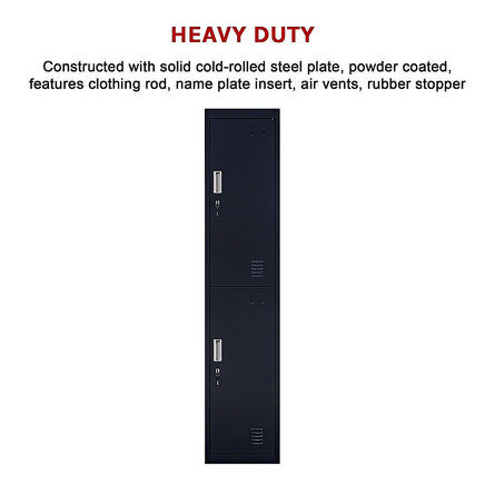 The locker is constructed with solid cold-rolled steel plate for sturdiness and durability and comes with standard locks (with 2 keys each) for worry-free storage.. The steel is also powder-coated to resist corrosion. The locker measures 180 x 38 x 45cm, and the maximum recommended weight capacity is approximately 30kg per locker. There are spaces designated for labels to help identify lockers, and air vents are built-in to assure sufficient ventilation.