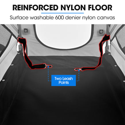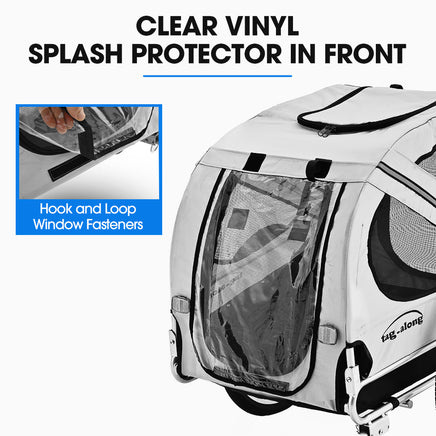 Your dog will enjoy a smooth, comfortable ride in the Tag-Along trailer. The spacious 267-litre cabin is covered in durable 600D nylon canvas with secure hook and loop fasteners that create a secure and comfortable passenger compartment for your best friend. The shell is rainproof to protect your furbaby from the elements.The cover features zip-up all-weather clear vinyl windows and sun-screening mosquito mesh. The floor padding is also covered in nylon canvas for easy care. It is removable, washable and offers your dog plenty of room to relax while you explore together.